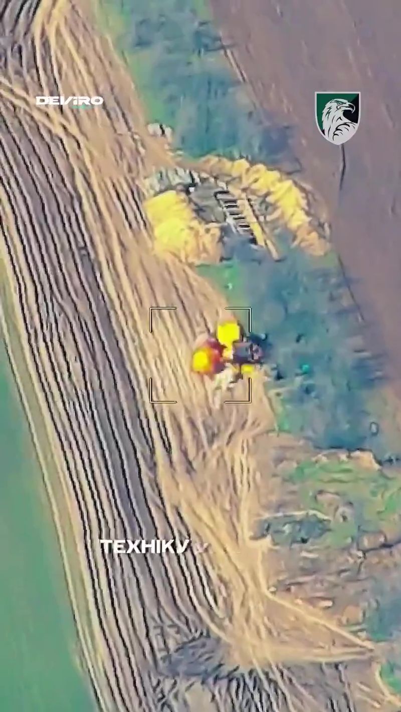 ウクライナ海兵隊第426無人システム連隊の攻撃ドローン(無人機)が、南部ヘルソン州のドニプロ川左岸側でロシア軍のカマズ軍用トラックを撃破した様子とされる画像。Xで共有された動画より