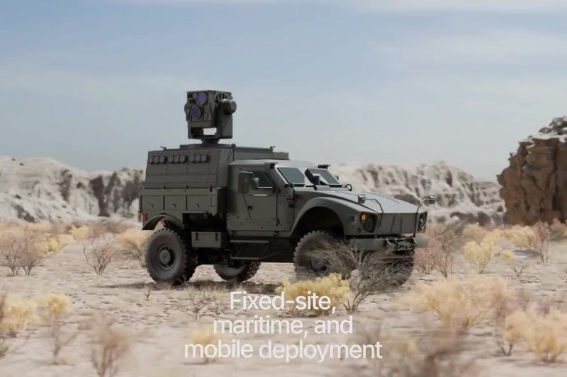 米エアロバイロンメント社が3月に発表したばかりのレーザー式対ドローンシステム「Locust(ローカスト)X3」。アイアンビームよりもさらに低コストで迎撃できると伝えられる(米エアロバイロンメント社がXで共有した動画のスクリーンショット)