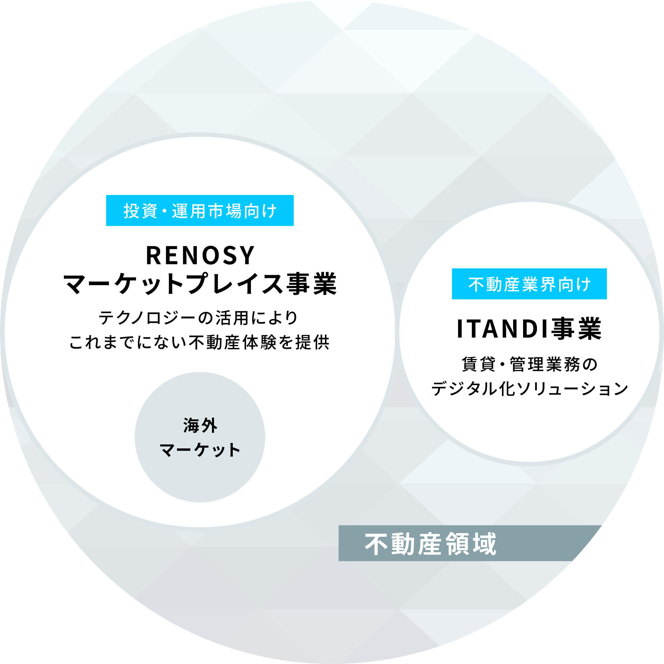 不動産業界に変革を起こすため、GA technologiesグループが展開する2つの事業。AI不動産投資「RENOSY」は購入・管理・売却をワンストップで提供。ITANDIでは不動産業務の効率化、ひいてはエンドユーザー体験の向上を実現させる。